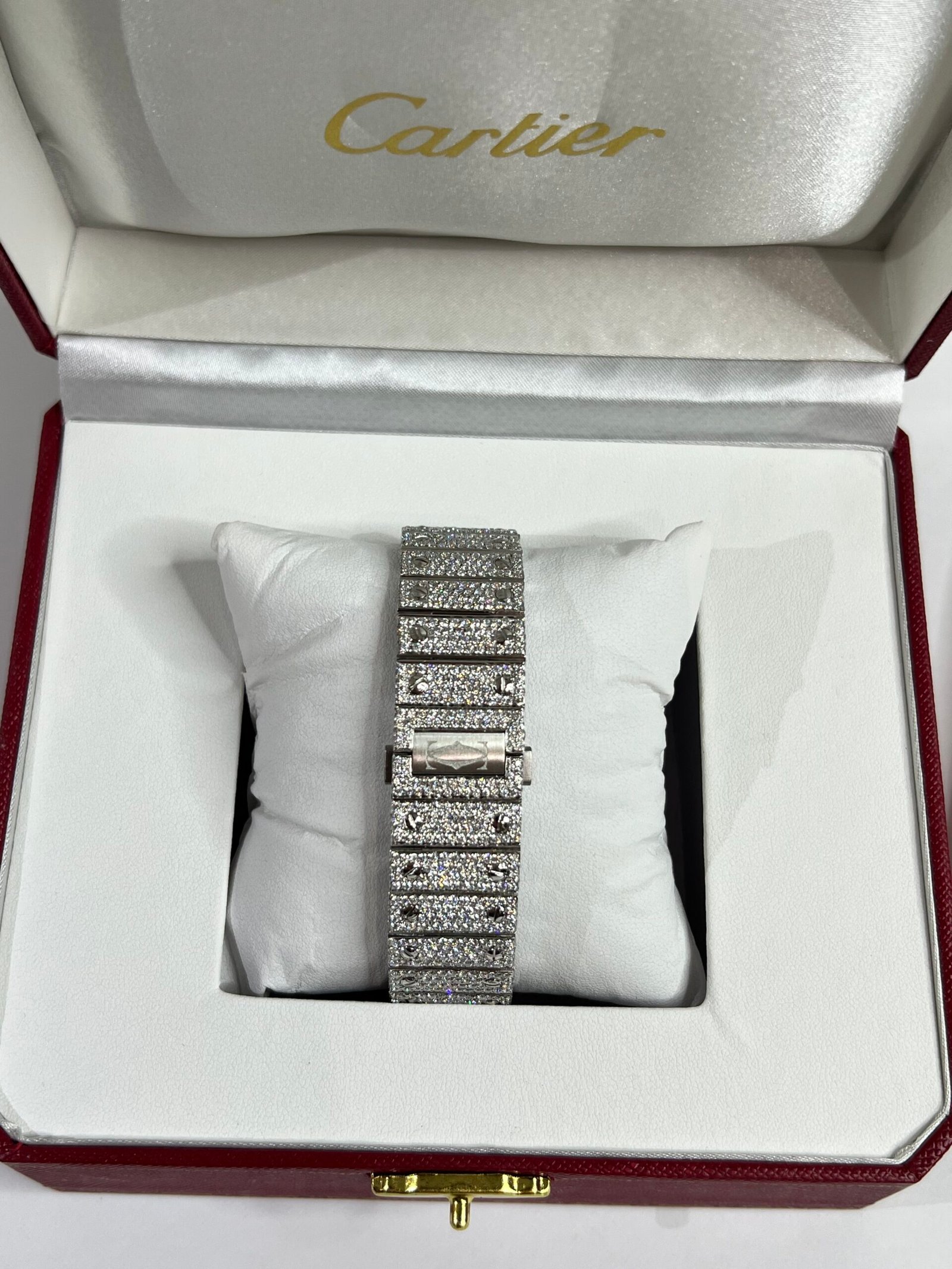 Luxury Carti watch with a fully iced‑out moissanite setting and a rainbow‑accented Arabic dial, showcasing intricate mechanical movement encrusted in sparkling moissanite stones for a vibrant, high‑gloss finish. The piece reflects premium craftsmanship and features a distinctive Arabic numeral dial with colorful rainbow detailing, ideal for collectors seeking statement luxury timepieces.