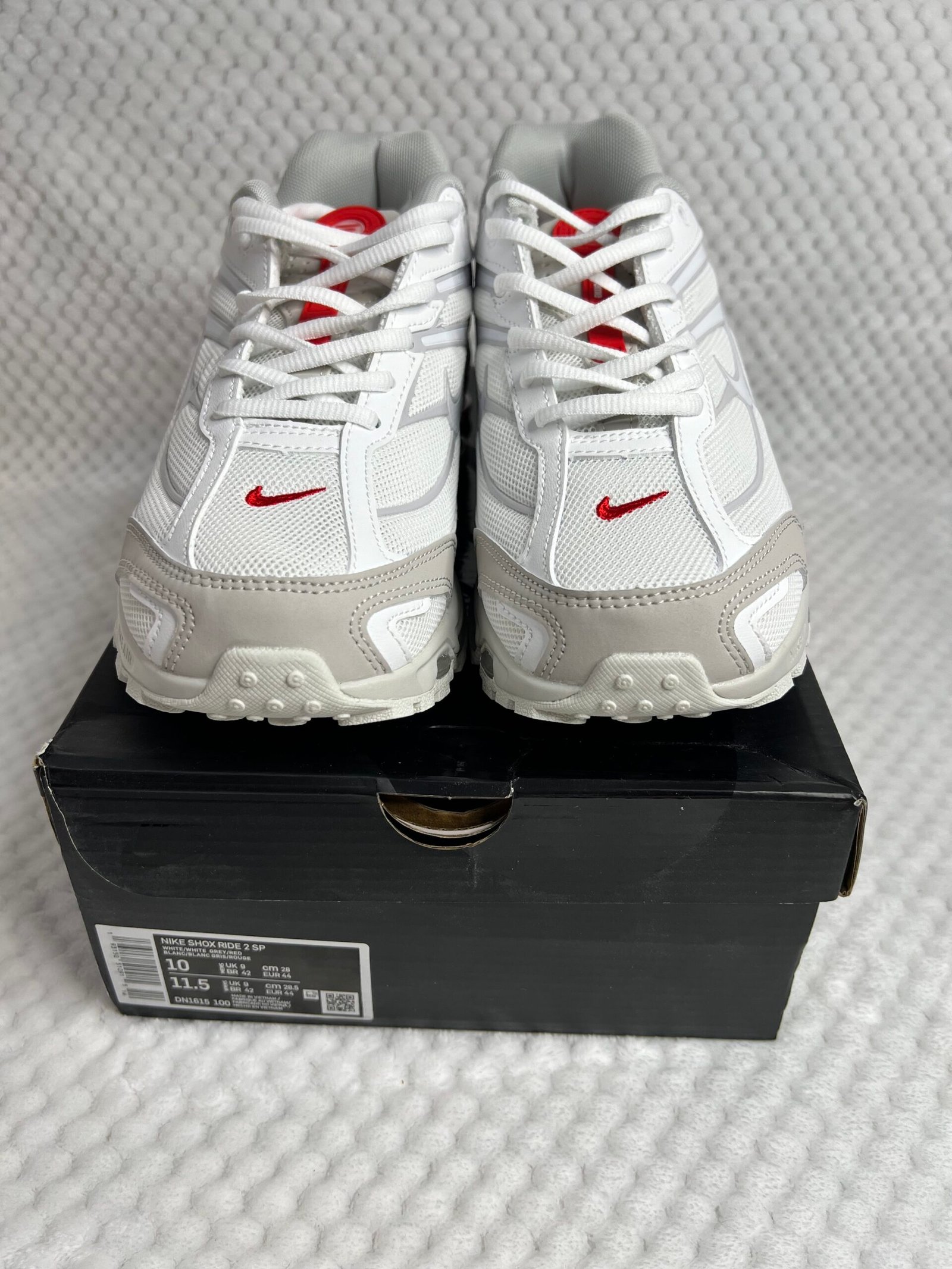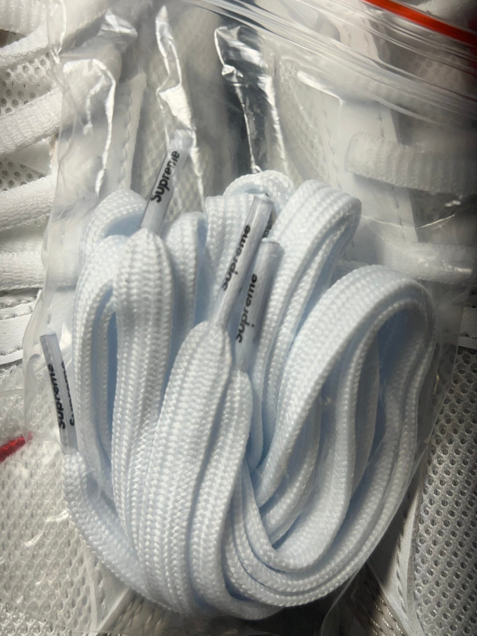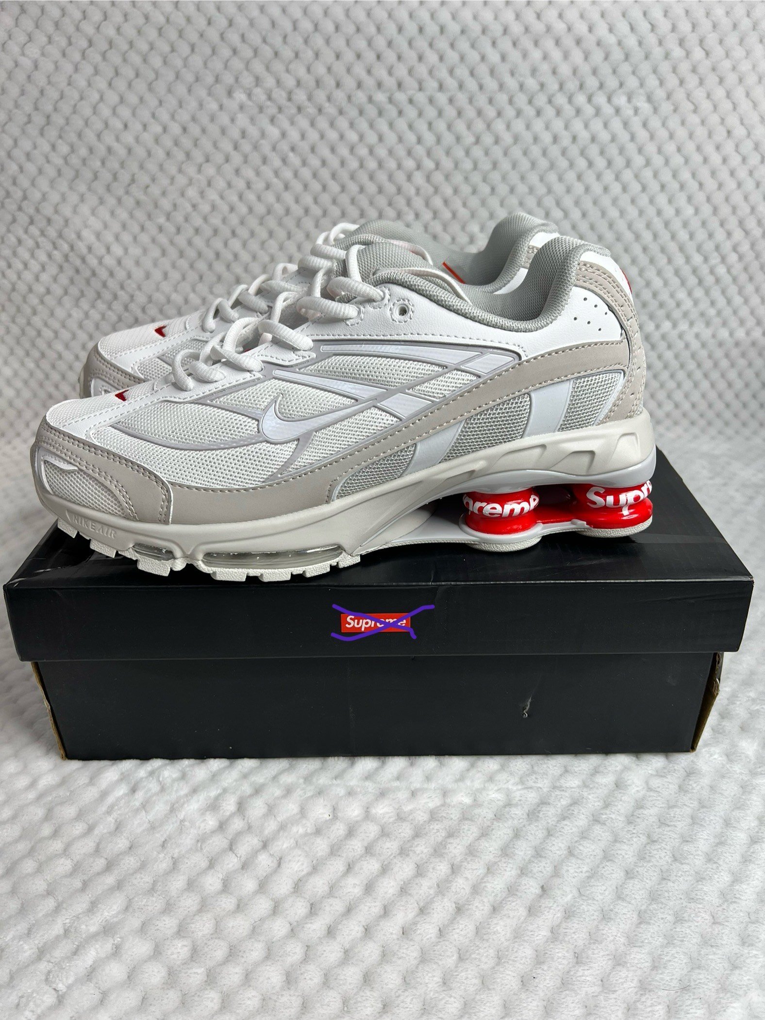 Air Max 90 x Sup “White” Shox sneakers, men’s size 10, featuring an all‑white leather and mesh upper with silver Swoosh accents and a pop of red detailing on the tongue and heel. The shoe overall presents a clean, street‑style collaboration aesthetic blending Nik performance with Sup iconic branding. comes with box and extra pair of sup laces.