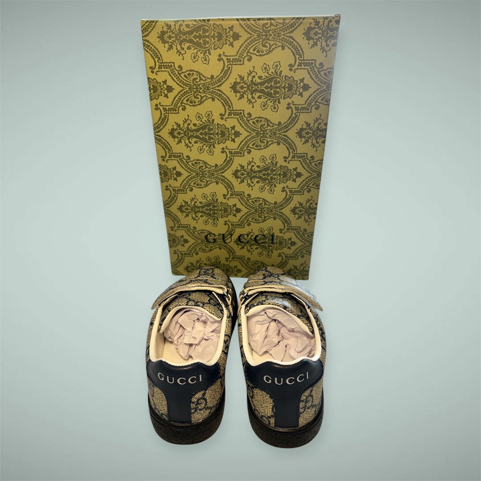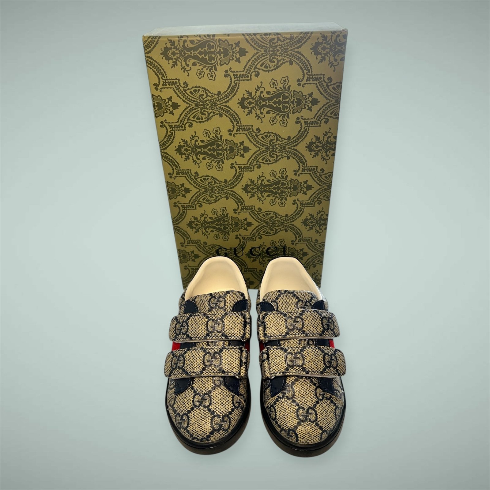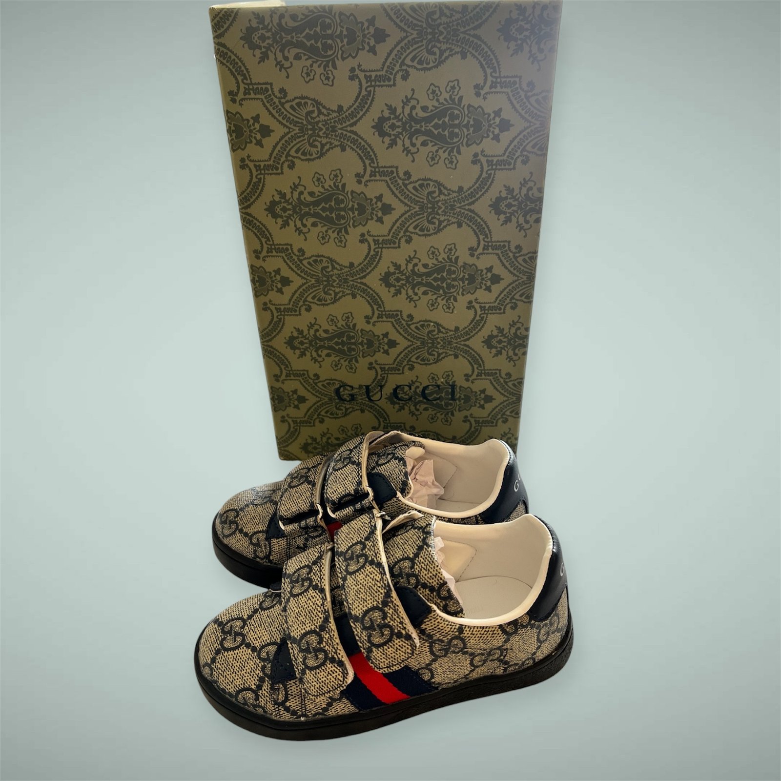 Toddler GG Monogram Canvas Shoes, size 8.5 toddler. Features a beige canvas upper with classic black GG monogram, navy leather trim, red accent stripe, and a bow detail on the lace-up front. Cream-colored interior and black rubber sole. Comes with the original box with ornate paisley pattern. Style perfect for luxe toddler fashion. UPGRADE YOUR KIDS STYLE TODAY! Brand new never used